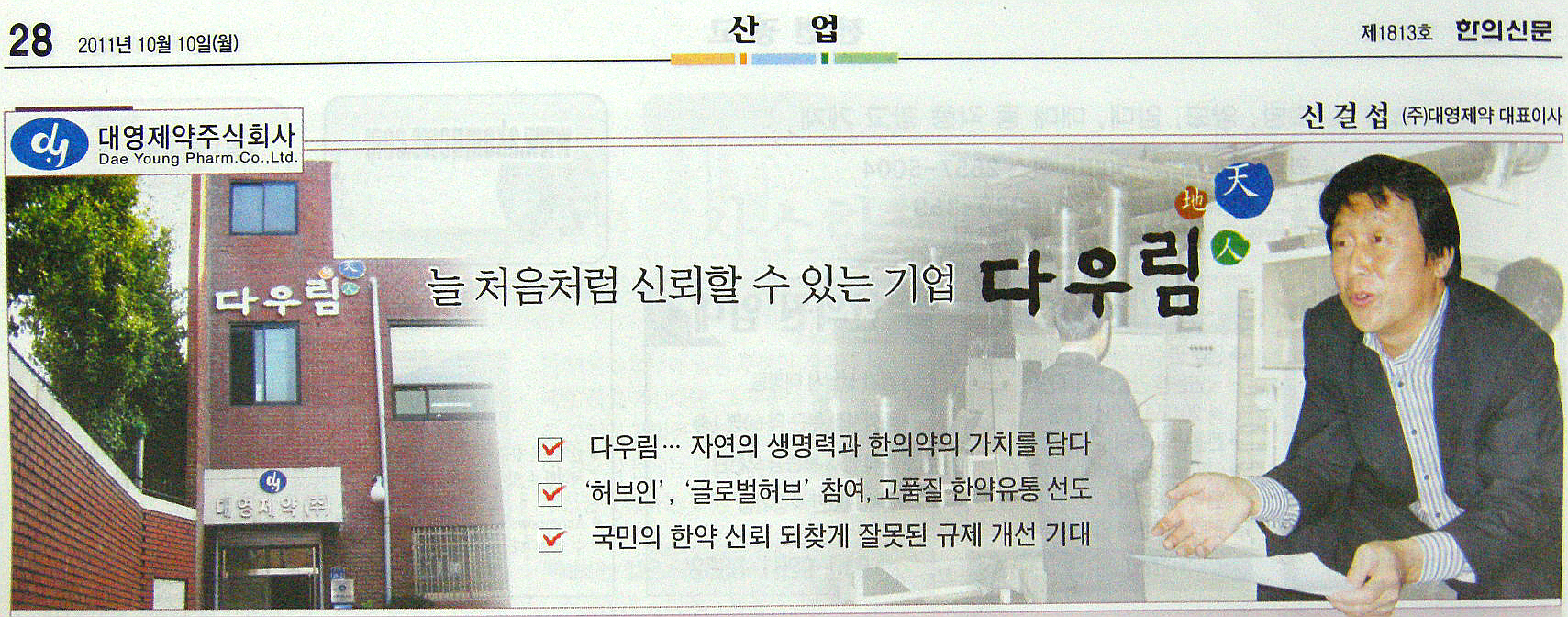 2001년 출범해 올해 10주년을 맞은 대영제약(dawoorim.co.kr)은 10년의 성상을 이어오고 있는 동안 ‘정직’과 ‘신뢰’를 무기로 “그 회사는 믿을만한 곳”이라는 입소문을 얻으며 고품질의 한약 유통을 선도하는 선두주자로서 입지를 다져 나가고 있다.